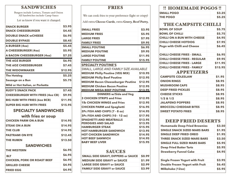 Main dinner selections include hearty plated meals such as Hamburger Steak with Fried Onions, grilled Pickerel with fries, Alaskan Pollock and Chips, and a 1lb Wing Dinner served with fries and coleslaw. These entrees are typically accompanied by vegetables, choice of potato, and gravy where applicable.